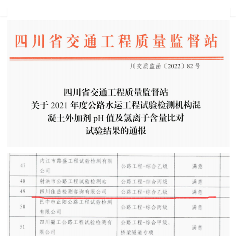 5月11日,四川省交通工程質(zhì)量監(jiān)督站印發(fā)《關(guān)于2021年度公路水運(yùn)工程試驗(yàn)檢測(cè)機(jī)構(gòu)混凝土外加劑PH值及氯離子含量比對(duì)試驗(yàn)結(jié)果的通報(bào),交建集團(tuán)四川佳岳檢測(cè)咨詢有限公司獲得“滿意”評(píng)價(jià)。