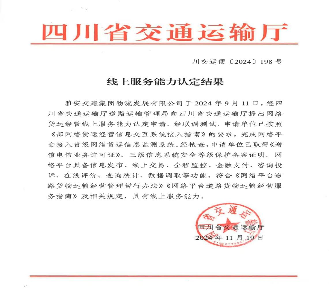 近日,《四川省交通運(yùn)輸廳線上服務(wù)能力認(rèn)定結(jié)果》發(fā)布,雅安交建集團(tuán)物流發(fā)展有限公司正式取得網(wǎng)絡(luò)貨運(yùn)經(jīng)營線上服務(wù)能力認(rèn)定,標(biāo)志著雅安首家國企網(wǎng)絡(luò)貨運(yùn)平臺即將面向市場運(yùn)營。