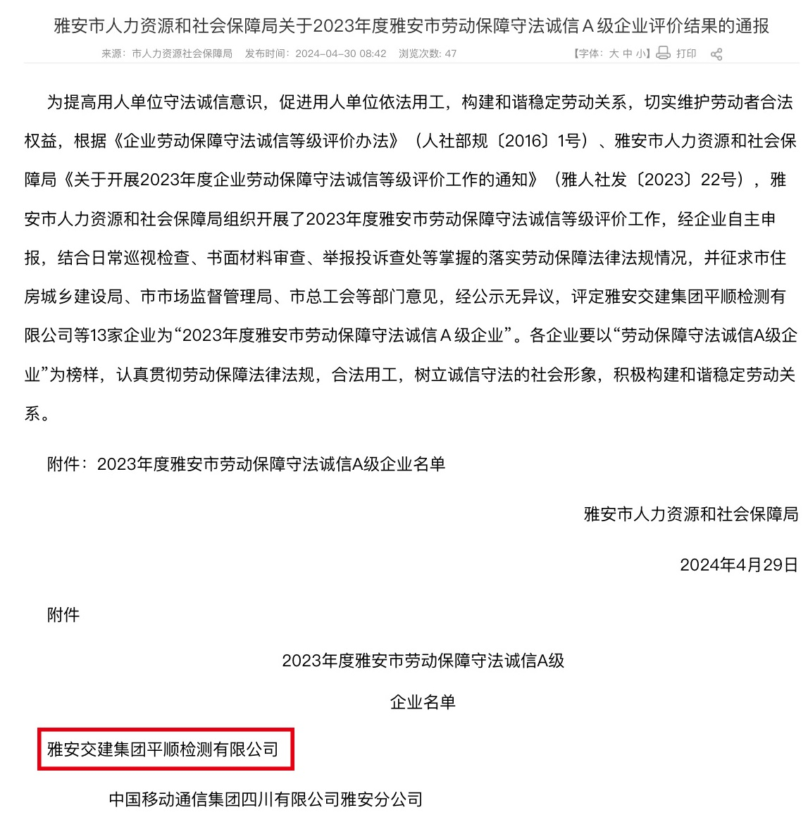 近日,雅安市人社局發(fā)布通報,雅安交建集團平順公司被評定為“2023年度雅安市勞動保障守法誠信A級企業(yè)”。此次評選由人社局結(jié)合日常巡視檢查、書面材料審查、舉報投訴查處以及專項檢查等活動掌握的落實勞動保障法律法規(guī)情況,并征求市場監(jiān)管局等部門和單位意見后,綜合評定而出。