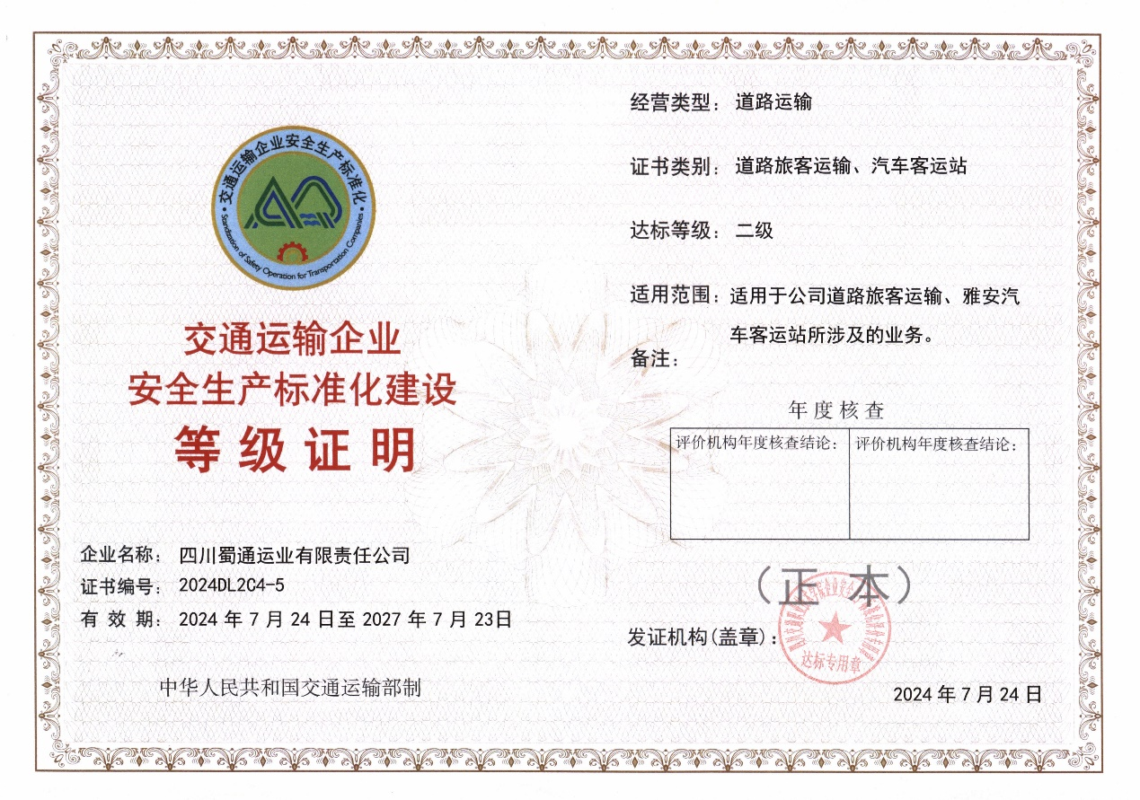 近日,經(jīng)四川省交通運(yùn)輸企業(yè)安全生產(chǎn)標(biāo)準(zhǔn)化評價機(jī)構(gòu)綜合評定,雅安交建集團(tuán)蜀通公司順利通過安全標(biāo)準(zhǔn)化二級企業(yè)驗(yàn)收并獲得等級證書,標(biāo)志著公司安全管理工作更趨于標(biāo)準(zhǔn)化,安全管理水平邁上了新臺階。