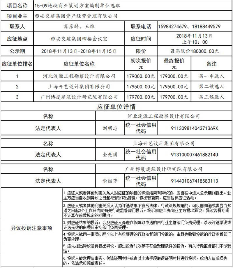 雅安交建集團(tuán)資產(chǎn)經(jīng)營管理有限公司15-09地塊商業(yè)策劃方案編制單位選取結(jié)果公示