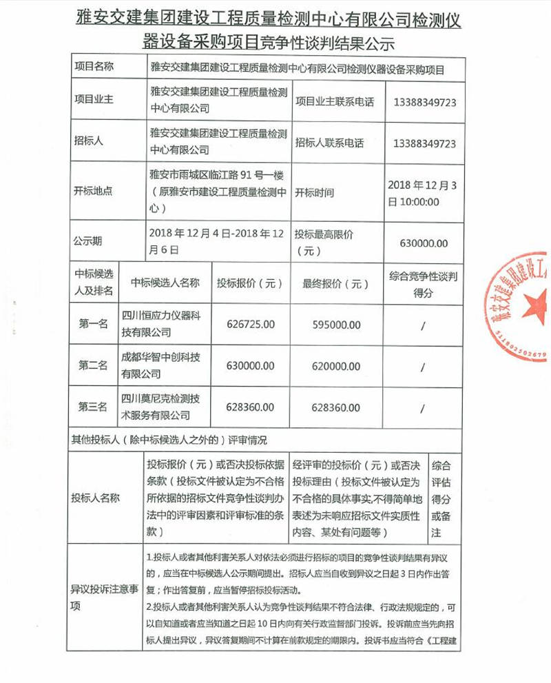 雅安交建集團建設工程質量檢測中心有限公司檢測儀器設備采購項目競爭性談判結果公示