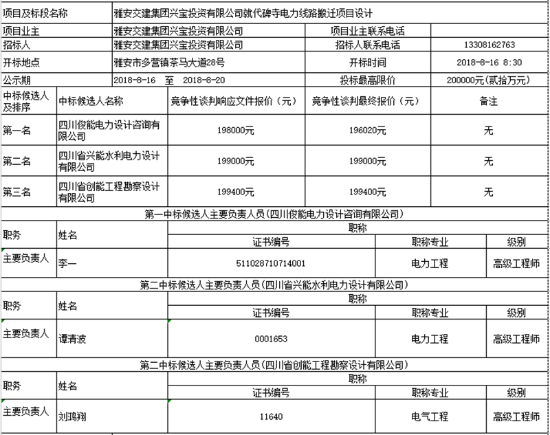 雅安交建集團(tuán)興寶投資有限公司就代碑寺電力線路搬遷項目設(shè)計競爭性談判中標(biāo)候選人公示