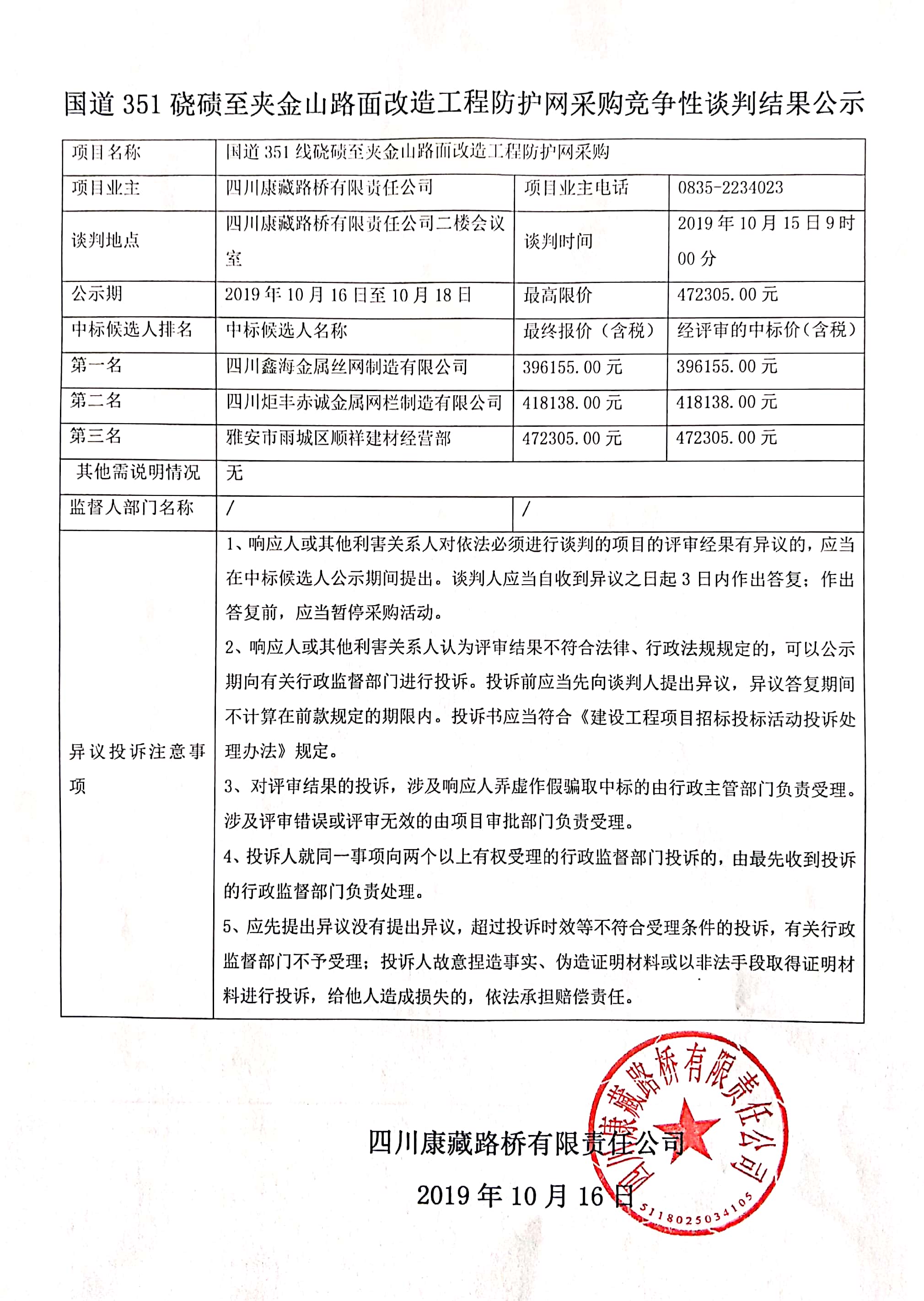 四川康藏路橋有限責(zé)任公司國道351磽磧至夾金山路面改造工程防護(hù)網(wǎng)采購競爭性談判結(jié)果公示