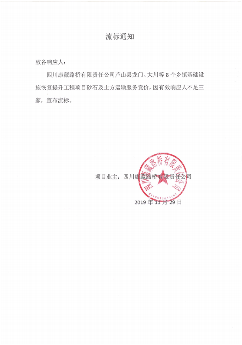 四川康藏路橋有限責(zé)任公司蘆山縣龍門、大川等8個鄉(xiāng)鎮(zhèn)基礎(chǔ)設(shè)施恢復(fù)提升工程項目砂石及土方運(yùn)輸服務(wù)競價流標(biāo)通知