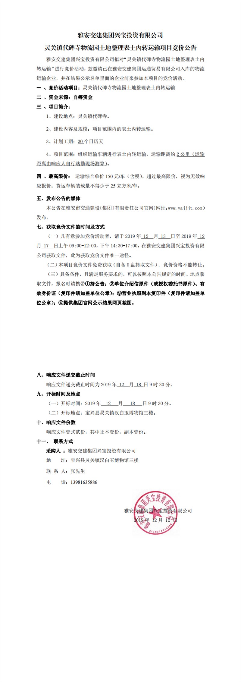 雅安交建集團興寶投資有限公司靈關鎮(zhèn)代碑寺物流園土地整理表土內轉運輸項目競價公告