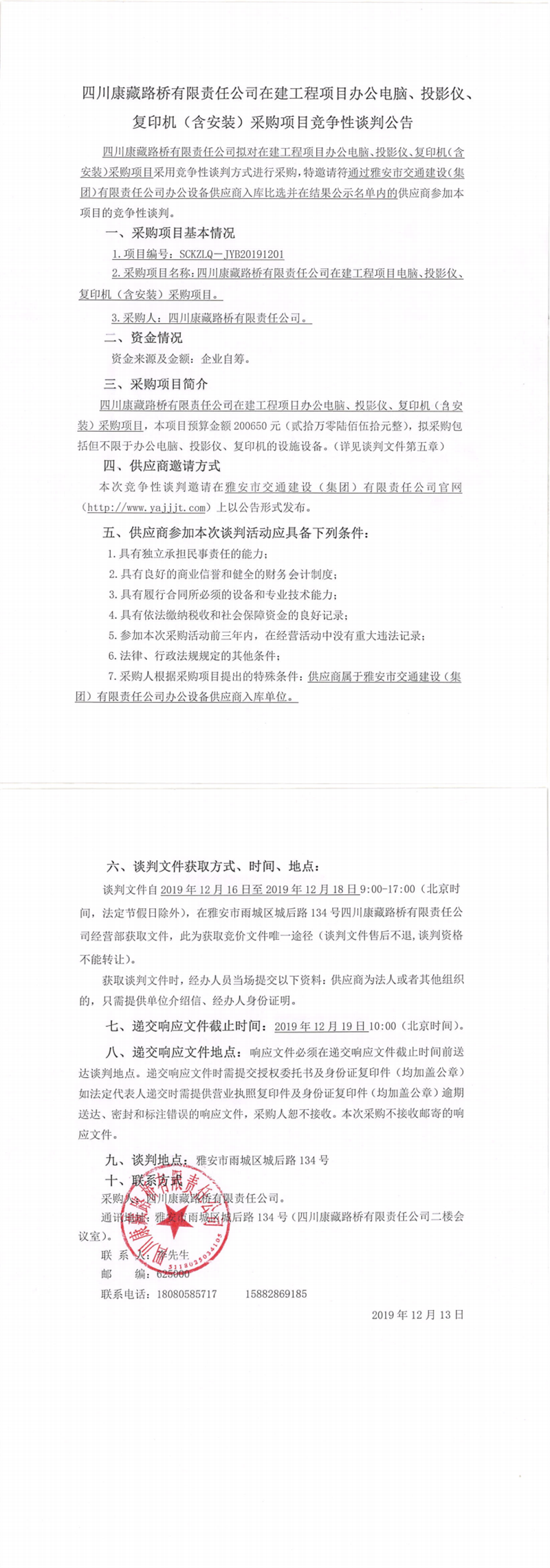 四川康藏路橋有限責(zé)任公司在建工程項目辦公電腦、投影儀、復(fù)印機(jī)(含安裝)采購項目競爭性談判公告