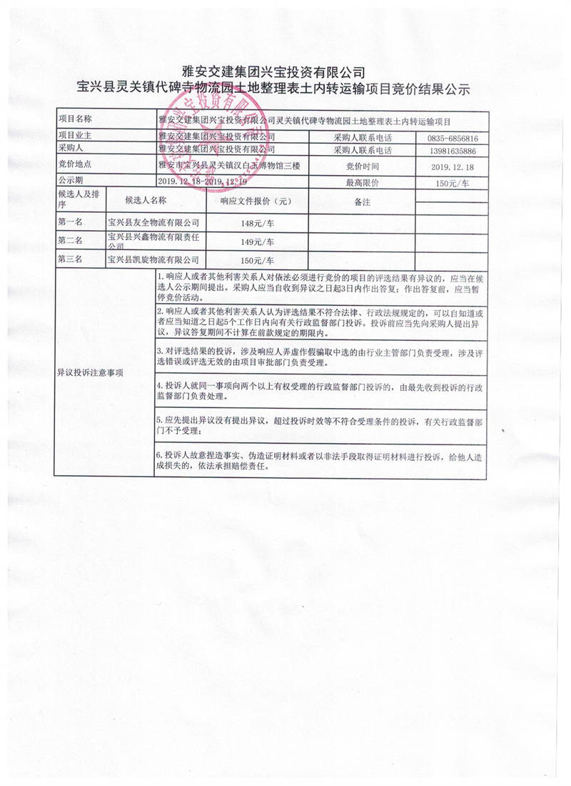 雅安交建集團(tuán)興寶投資有限公司寶興縣靈關(guān)鎮(zhèn)代碑寺物流園土地整理表土內(nèi)轉(zhuǎn)運輸項目競價結(jié)果公示