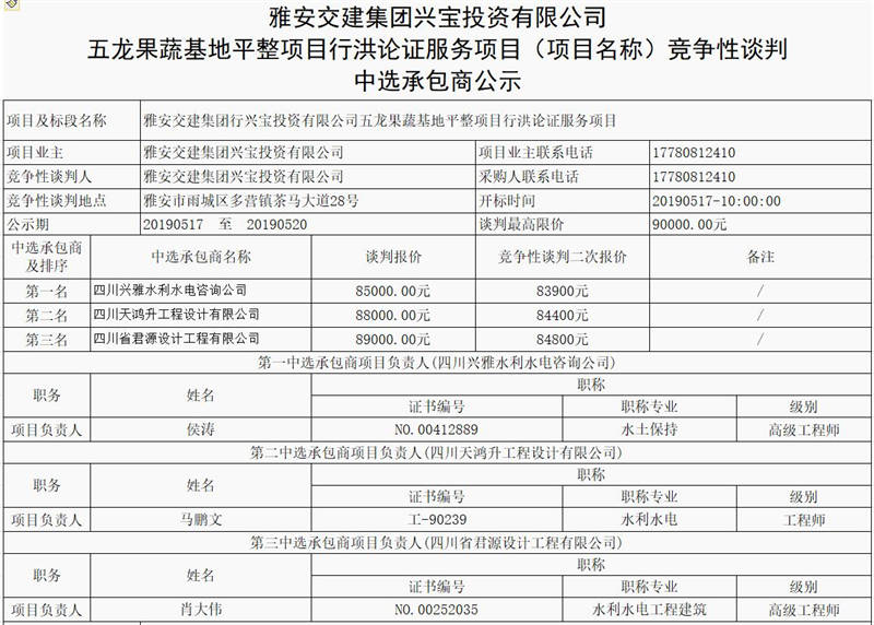 雅安交建集團(tuán)興寶投資有限公司五龍果蔬基地平整項(xiàng)目行洪論證服務(wù)項(xiàng)目(項(xiàng)目名稱)競(jìng)爭性談判 中選承包商公示