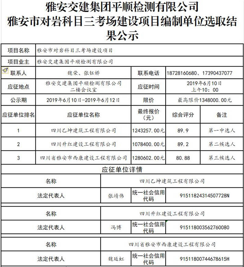雅安交建集團平順檢測有限公司雅安市對巖科目三考場建設(shè)項目編制單位選取結(jié)果公示