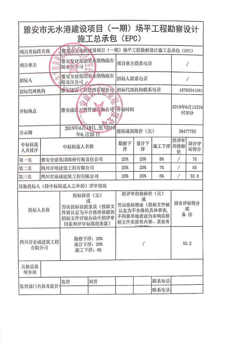 雅安市無水港建設(shè)項(xiàng)目(一期)場平工程勘察設(shè)計(jì)施工總承包(EPC)公開招標(biāo)結(jié)果公示