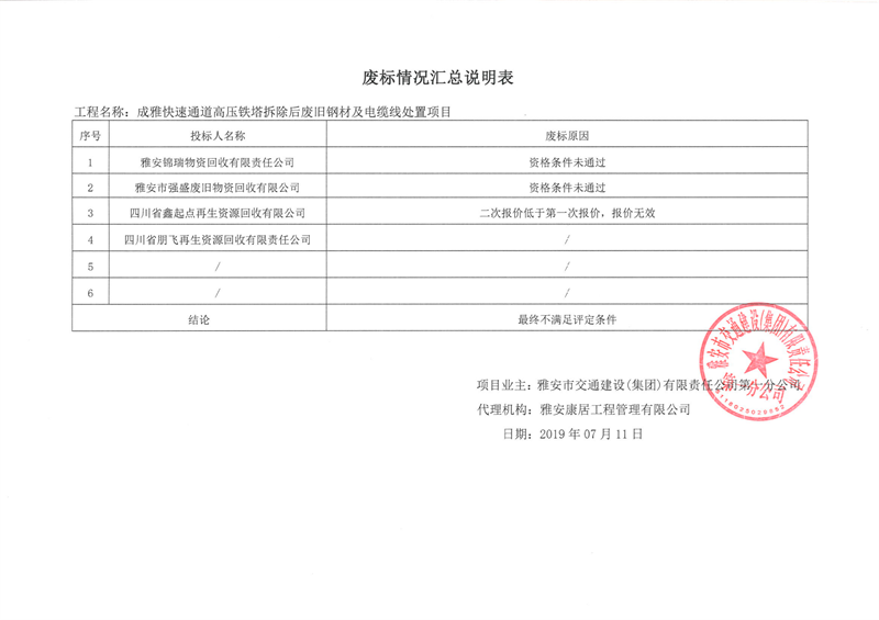 雅安市交通建設(shè)(集團(tuán))有限責(zé)任公司第一分公司成雅快速通道高壓鐵塔拆除后廢舊鋼材及電纜線處置項(xiàng)目廢標(biāo)情況匯總說(shuō)明表