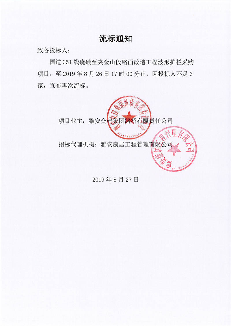 雅安交建集團(tuán)路橋有限責(zé)任公司國道351線蹺磧至夾金山段路面改造工程波形護(hù)欄采購項目流標(biāo)通知