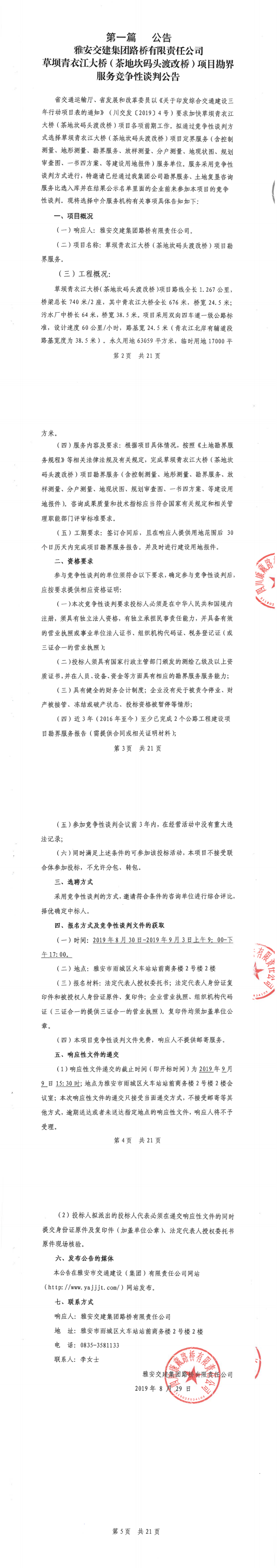 雅安交建集團(tuán)路橋有限責(zé)任公司草壩青衣江大橋(茶地坎碼頭渡改橋)項(xiàng)目勘界服務(wù)競(jìng)爭(zhēng)性談判公告