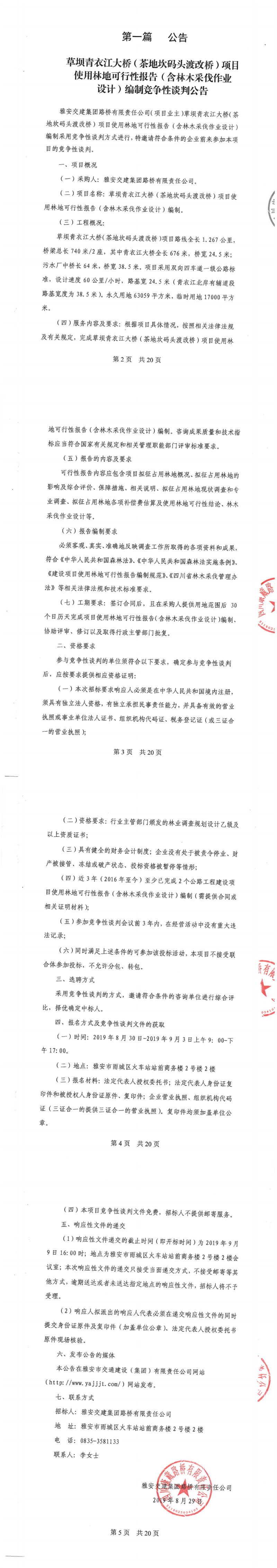 雅安交建集團(tuán)路橋有限責(zé)任公司草壩青衣江大橋(茶地坎碼頭渡改橋)使用林地可行性報(bào)告(含林木采伐作業(yè)設(shè)計(jì))編制競(jìng)爭(zhēng)性談判公告