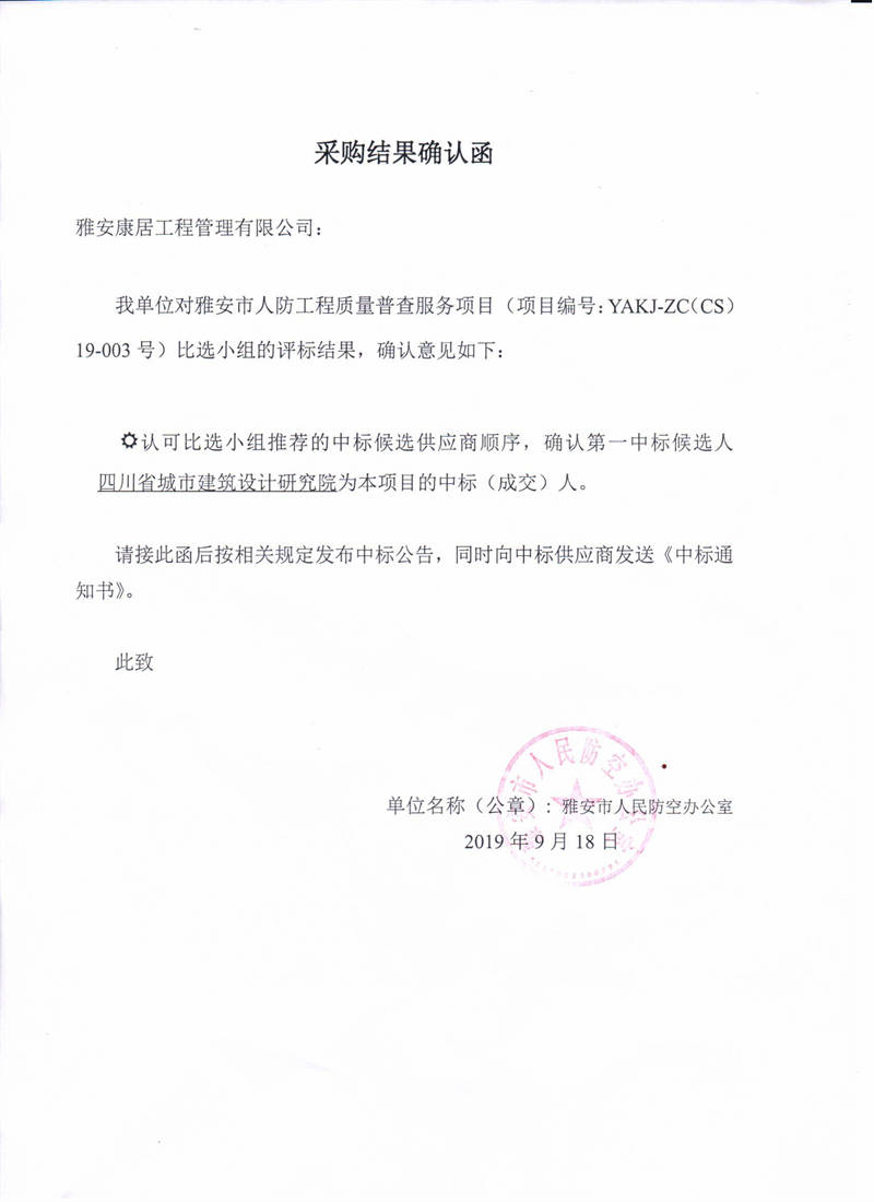 雅安市人民防空辦公室雅安市人防工程質(zhì)量普查服務(wù)項目評標結(jié)果公示