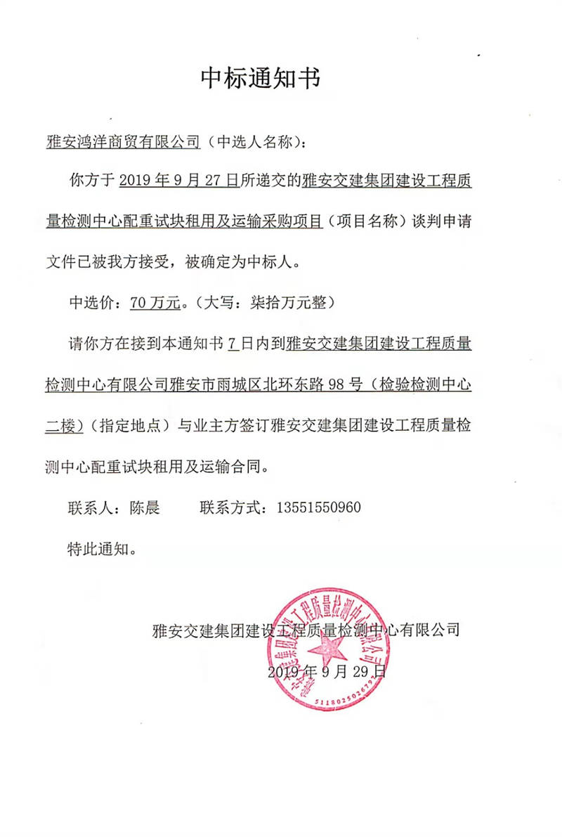 雅安交建集團(tuán)建設(shè)工程質(zhì)量檢測(cè)中心配重試塊租用及運(yùn)輸采購(gòu)項(xiàng)目中標(biāo)公示