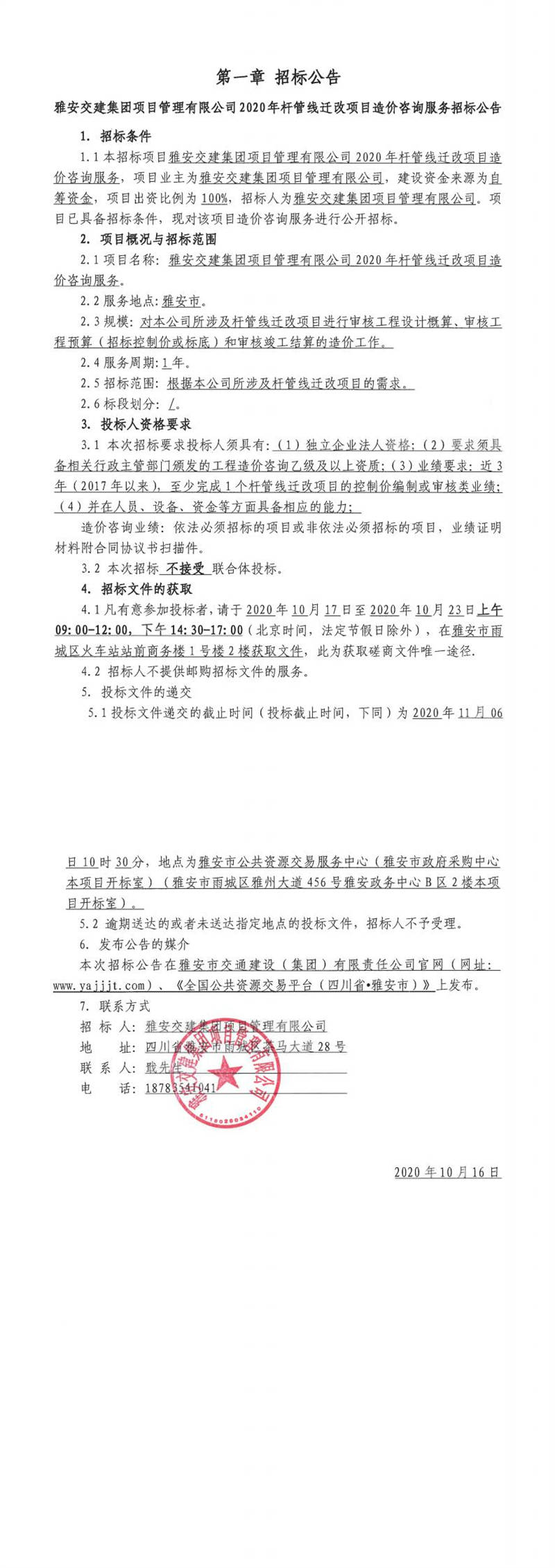 雅安交建集團項目管理有限公司2020年桿管線遷改項目造價咨詢服務招標公告