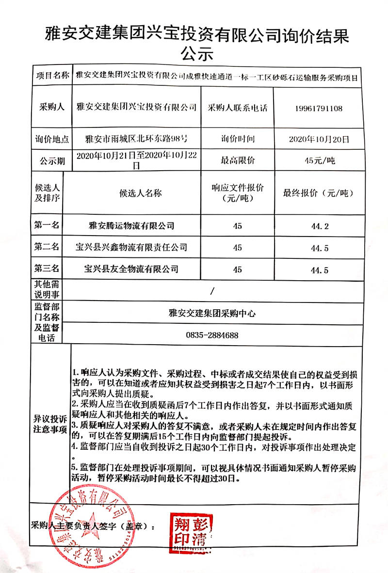 雅安交建集團興寶投資有限公司成雅快速通道一標一工區(qū)砂礫石運輸服務采購項目詢價結果公示