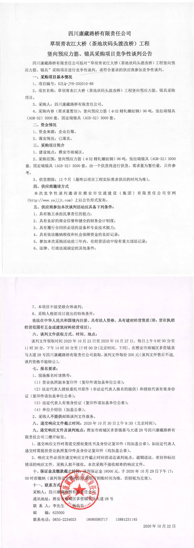 四川康藏路橋有限責任公司草壩青衣江大橋(茶地坎碼頭渡改橋)工程豎向預(yù)應(yīng)力筋、錨具采購項目競爭性談判公告