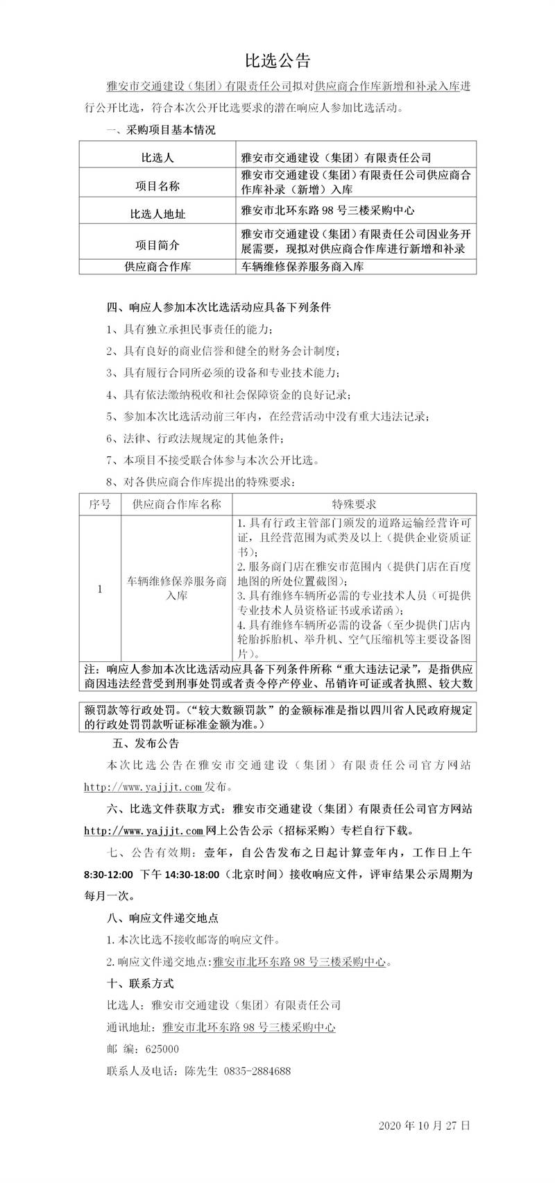 雅安市交通建設(shè)(集團(tuán))有限責(zé)任公司供應(yīng)商合作庫補錄(新增)入庫比選公告