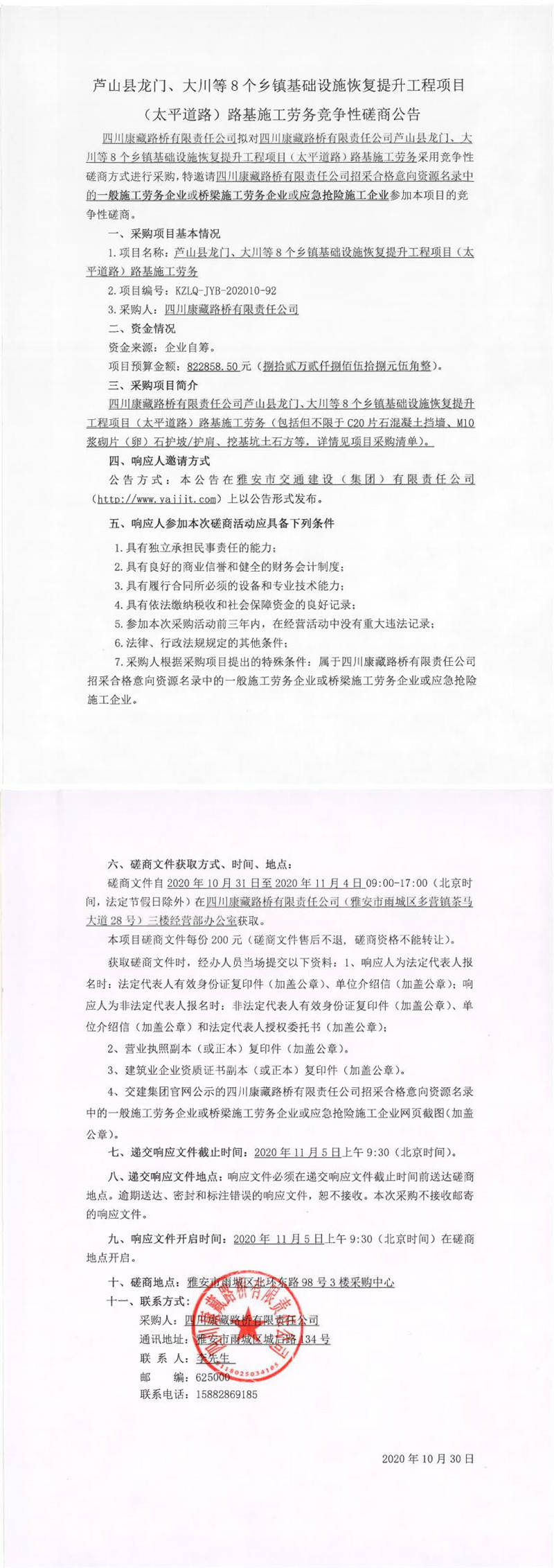 四川康藏路橋有限責(zé)任公司蘆山縣龍門、大川等8個(gè)鄉(xiāng)鎮(zhèn)基礎(chǔ)設(shè)施恢復(fù)提升工程項(xiàng)目(太平道路)路基施工勞務(wù)競爭性磋商公告