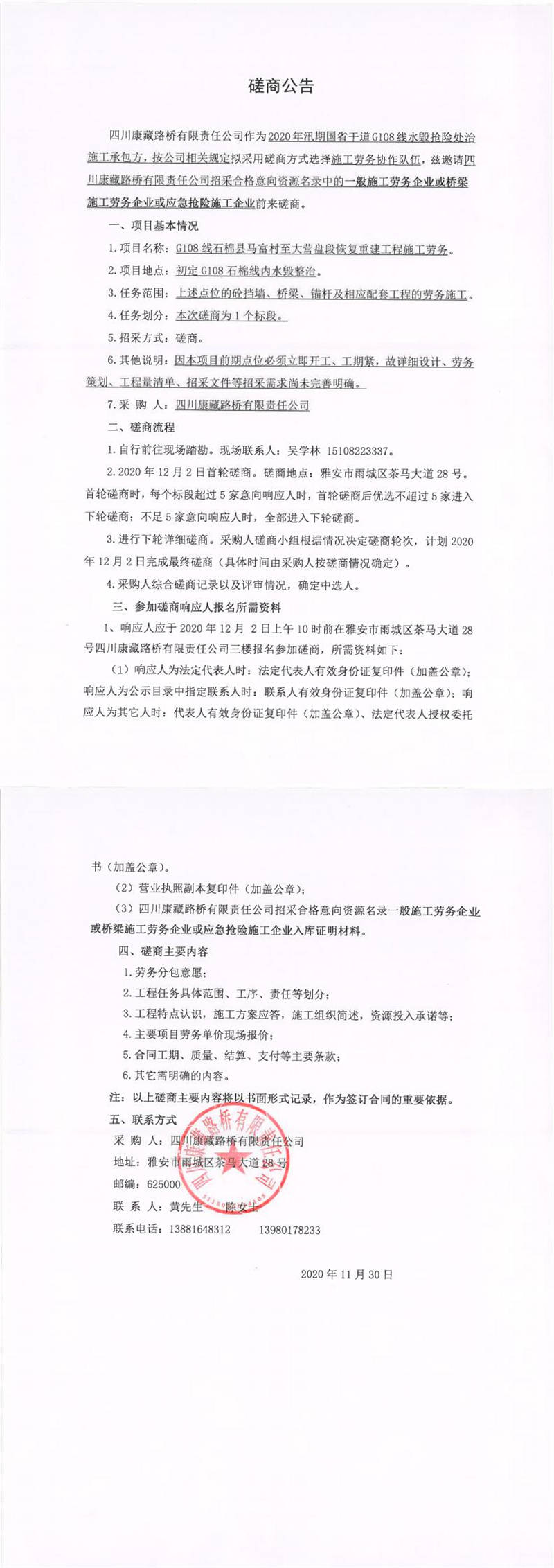 四川康藏路橋有限責(zé)任公司G108線石棉縣馬富村至大營(yíng)盤段恢復(fù)重建工程施工勞務(wù)磋商公告