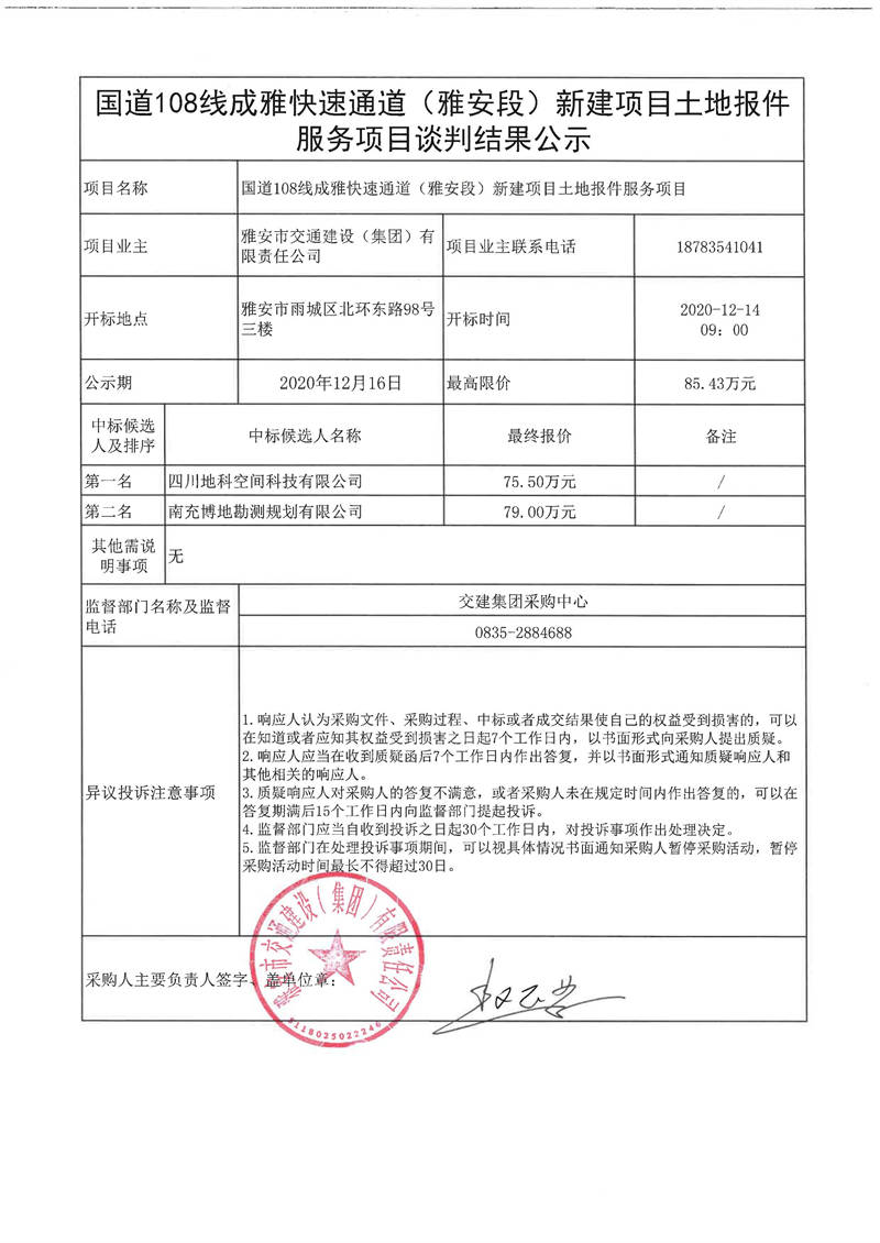 雅安市交通建設(shè)(集團(tuán))有限責(zé)任公司國道108線成雅快速通道(雅安段)新建項(xiàng)目土地報件服務(wù)項(xiàng)目談判結(jié)果公示