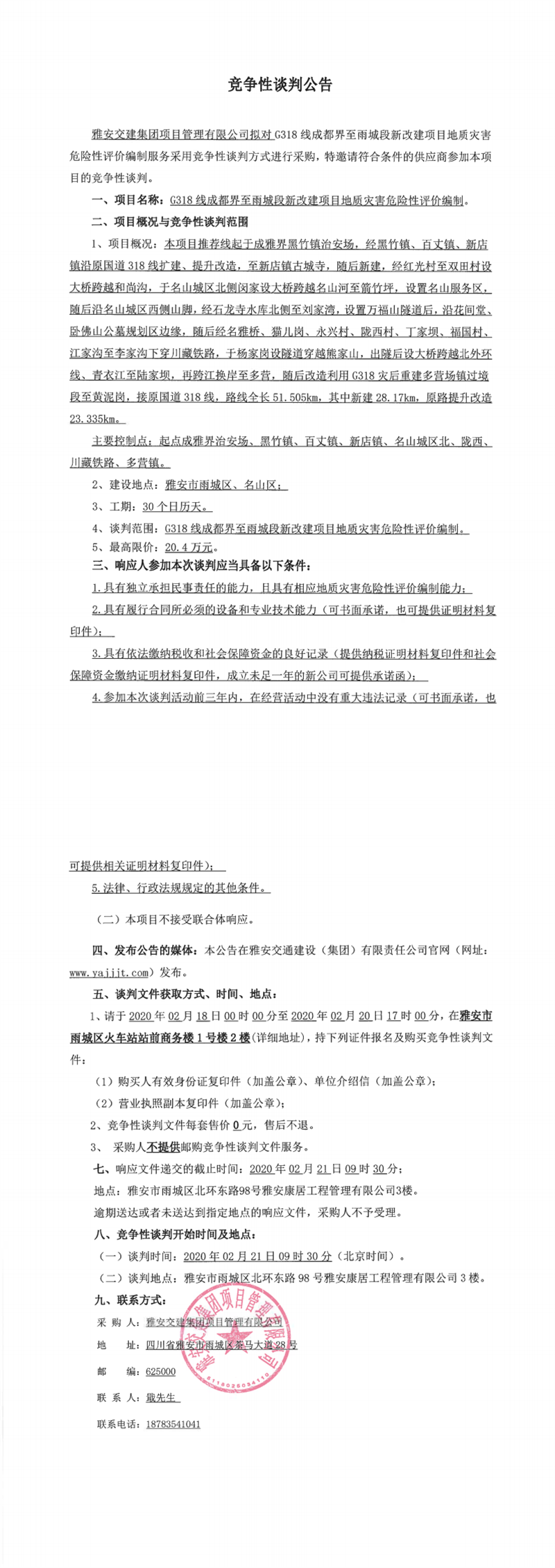 雅安交建集團項目管理有限公司G318線成都界至雨城段新改建項目地質(zhì)災害危險性評價編制競爭性談判公告