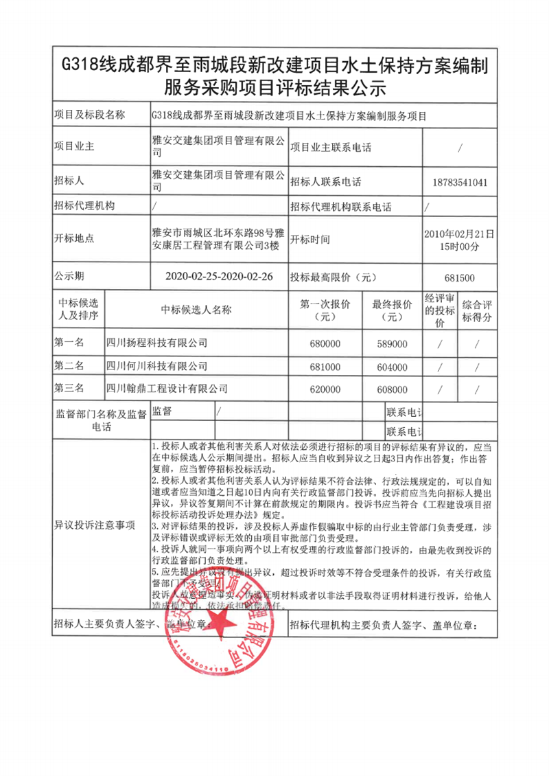 雅安交建集團(tuán)項(xiàng)目管理有限公司G318線成都界至雨城段新改建項(xiàng)目水土保持方案編制服務(wù)采購(gòu)項(xiàng)目評(píng)標(biāo)結(jié)果公示