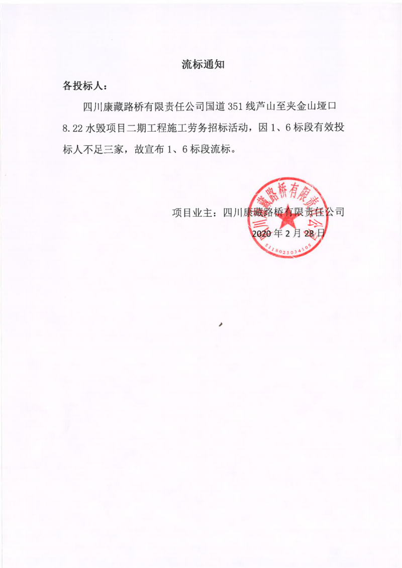 四川康藏路橋有限責(zé)任公司國道351線蘆山至夾金山埡口8.22水毀項目二期工程施工勞務(wù)(1標(biāo)段、6標(biāo)段)流標(biāo)通知