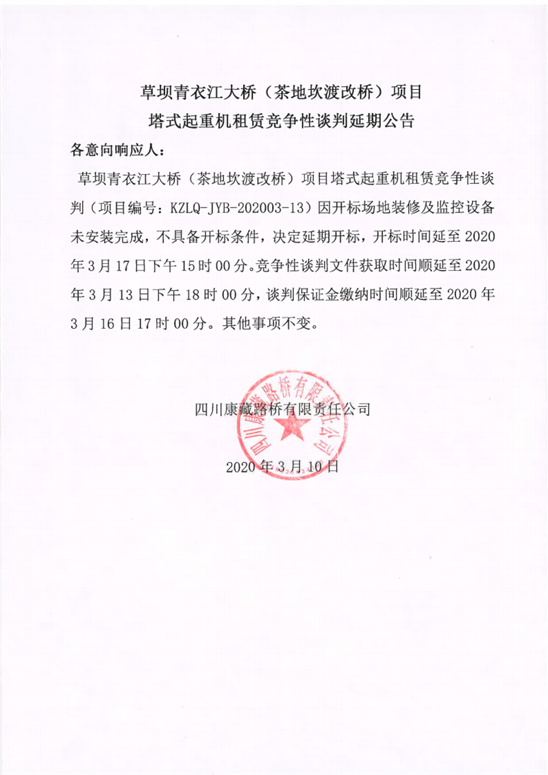 四川康藏路橋有限責(zé)任公司草壩青衣江大橋(茶地坎碼頭渡改橋)項(xiàng)目塔式起重機(jī)租賃競爭性談判延期公告
