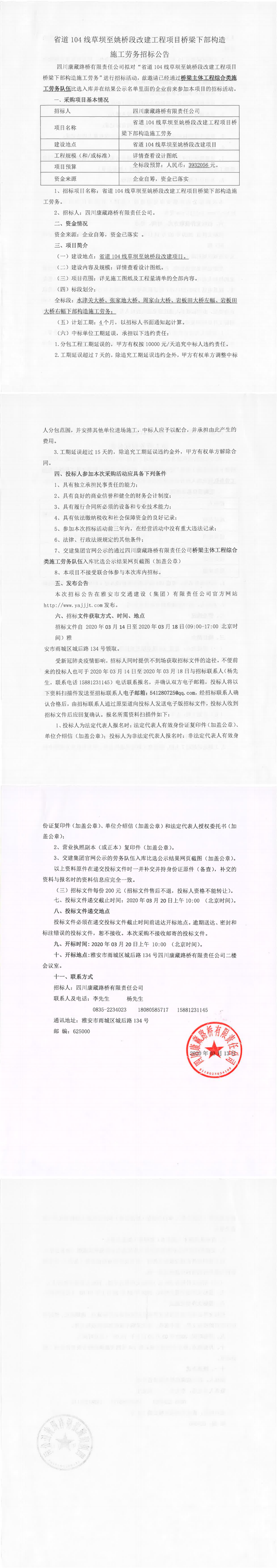 四川康藏路橋有限責任公司省道104線草壩至姚橋段改建工程項目橋梁下部構造施工勞務招標公告