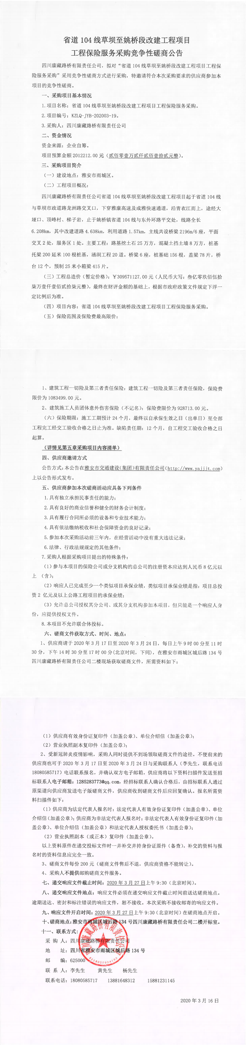 四川康藏路橋有限責(zé)任公司省道104線草壩至姚橋段改建工程項目工程保險服務(wù)采購競爭性磋商公告