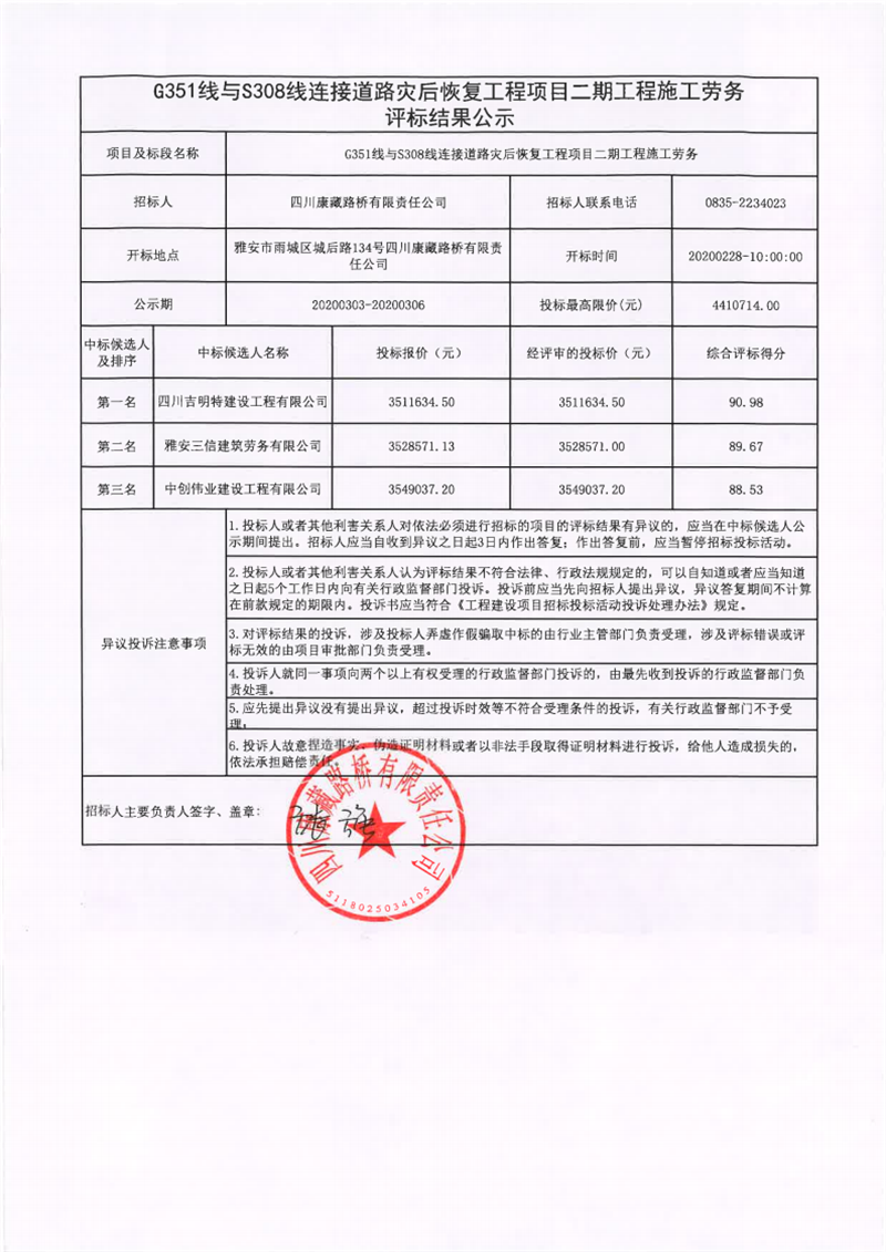 四川康藏路橋有限責(zé)任公司G351線與S308線連接道路災(zāi)后恢復(fù)工程項(xiàng)目二期工程施工勞務(wù)評標(biāo)結(jié)果公示