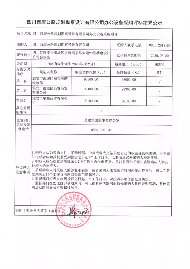 四川西康公路規(guī)劃勘察設計有限公司辦公設備采購評標結(jié)果公示