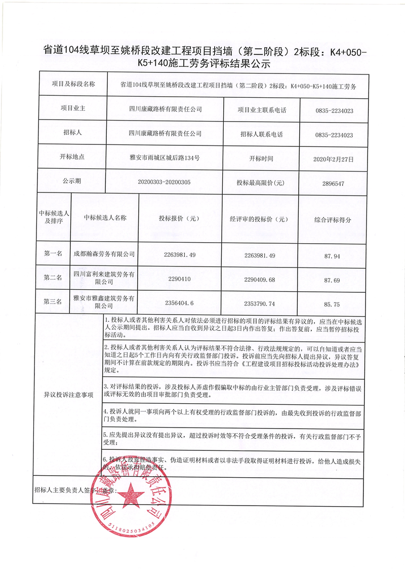 四川康藏路橋有限責任公司省道104線草壩至姚橋段改建工程項目擋墻(第二階段)2標段:K4+050-K5+140施工勞務評標結(jié)果公示
