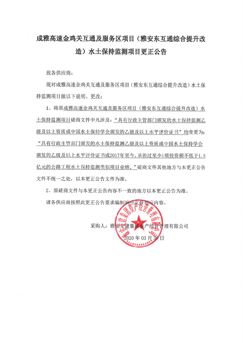 雅安交建集團(tuán)資產(chǎn)經(jīng)營(yíng)管理有限公司成雅高速金雞關(guān)互通及服務(wù)區(qū)項(xiàng)目(雅安東互通綜合提升改造)水土保持監(jiān)測(cè)項(xiàng)目更正公告