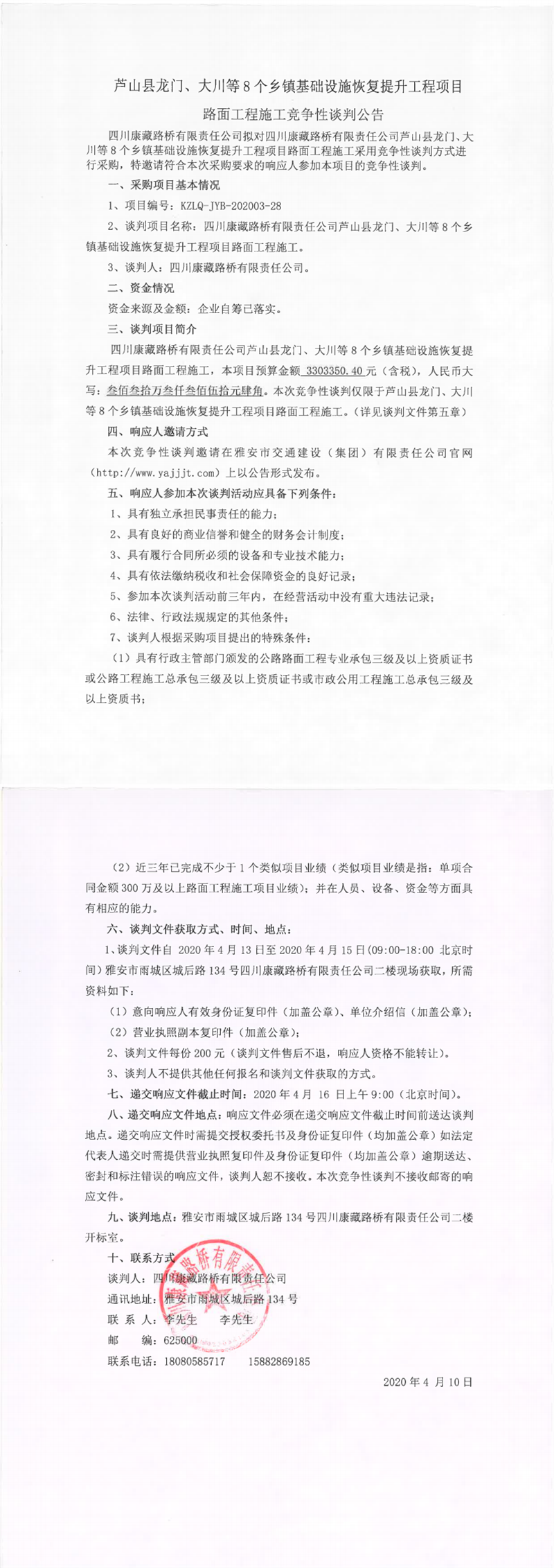 四川康藏路橋有限責(zé)任公司蘆山縣龍門、大川等8個鄉(xiāng)鎮(zhèn)基礎(chǔ)設(shè)施恢復(fù)提升工程項目路面工程施工競爭性談判公告