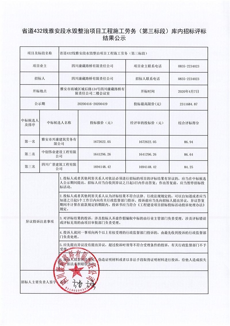 四川康藏路橋有限責任公司省道432線雅安段水毀整治項目工程施工勞務(第三標段)庫內(nèi)招標評標結(jié)果公示