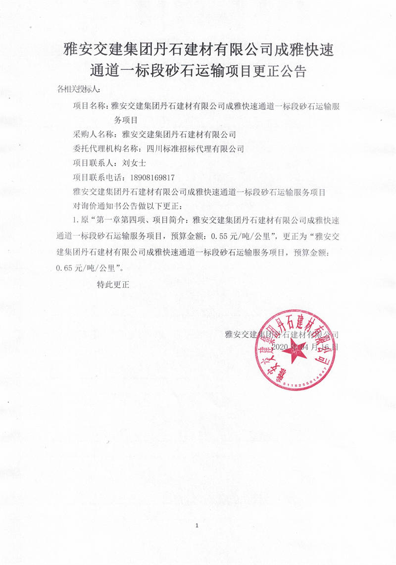 雅安交建集團(tuán)丹石建材有限公司成雅快速通道一標(biāo)段砂石運(yùn)輸服務(wù)項(xiàng)目更正公告