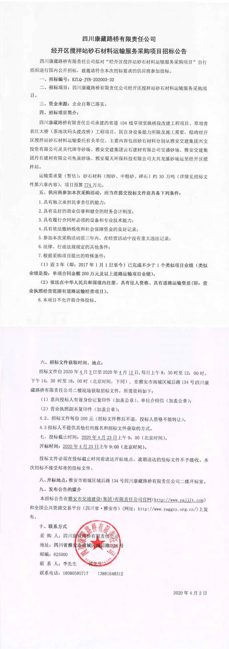 四川康藏路橋有限責(zé)任公司經(jīng)開(kāi)區(qū)攪拌站砂石材料運(yùn)輸服務(wù)采購(gòu)項(xiàng)目招標(biāo)公告
