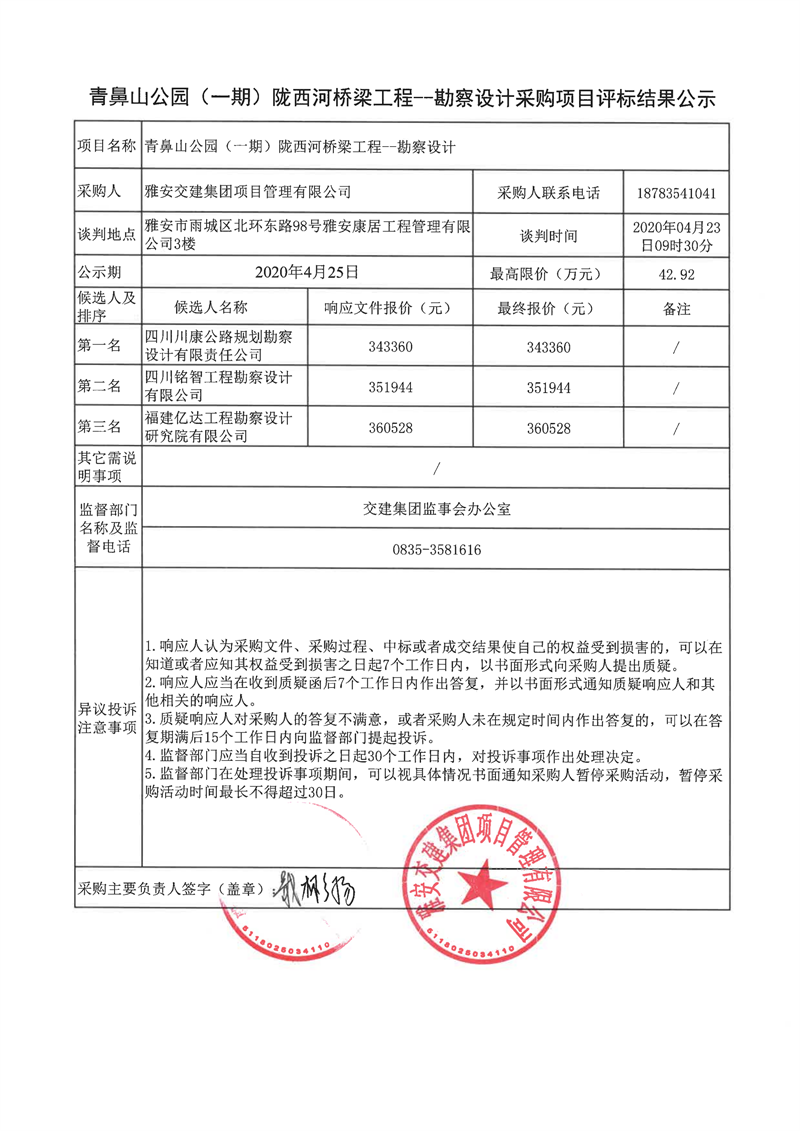 雅安交建集團(tuán)項(xiàng)目管理有限公司青鼻山公園(一期)隴西河橋梁工程項(xiàng)目勘察設(shè)計(jì)采購項(xiàng)目評(píng)標(biāo)結(jié)果公示