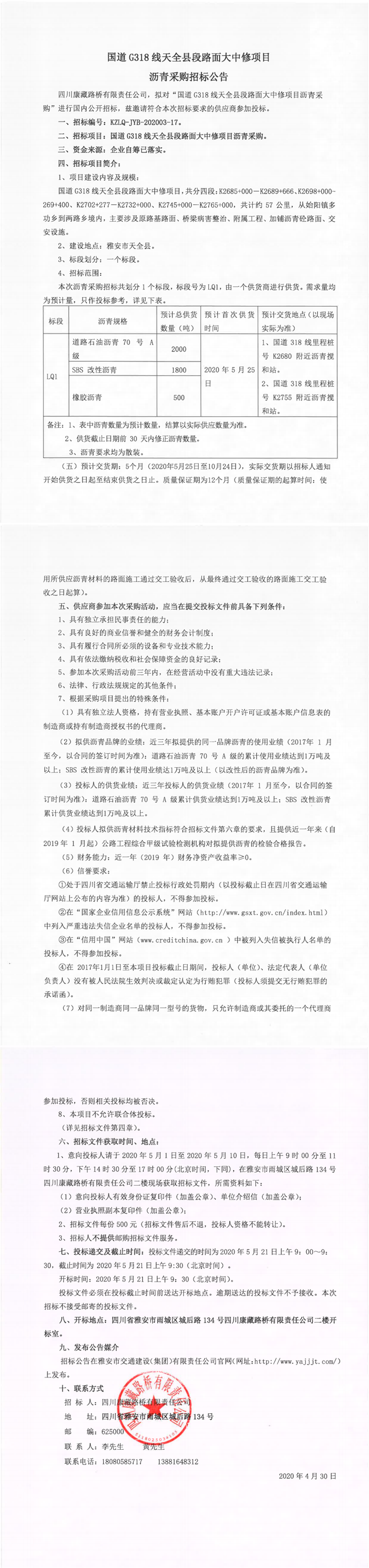 四川康藏路橋有限責(zé)任公司國(guó)道G318線天全縣段路面大中修項(xiàng)目瀝青采購(gòu)招標(biāo)公告