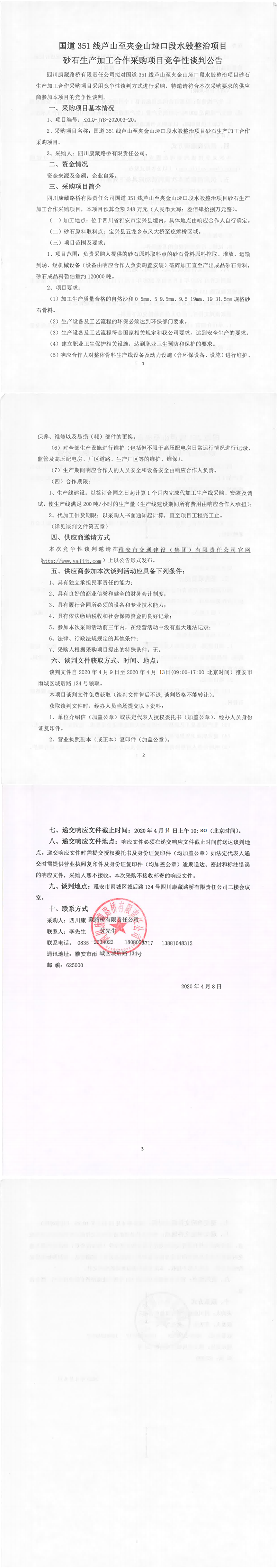 四川康藏路橋有限責任公司國道351線蘆山至夾金山埡口段水毀整治項目砂石生產加工合作采購項目競爭性談判公告