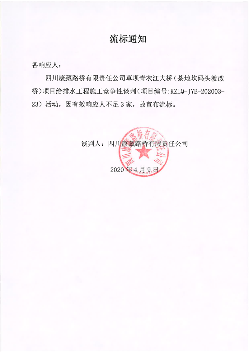 四川康藏路橋有限責(zé)任公司草壩青衣江大橋(茶地坎碼頭渡改橋)項(xiàng)目給排水工程施工競(jìng)爭(zhēng)性談判流標(biāo)通知