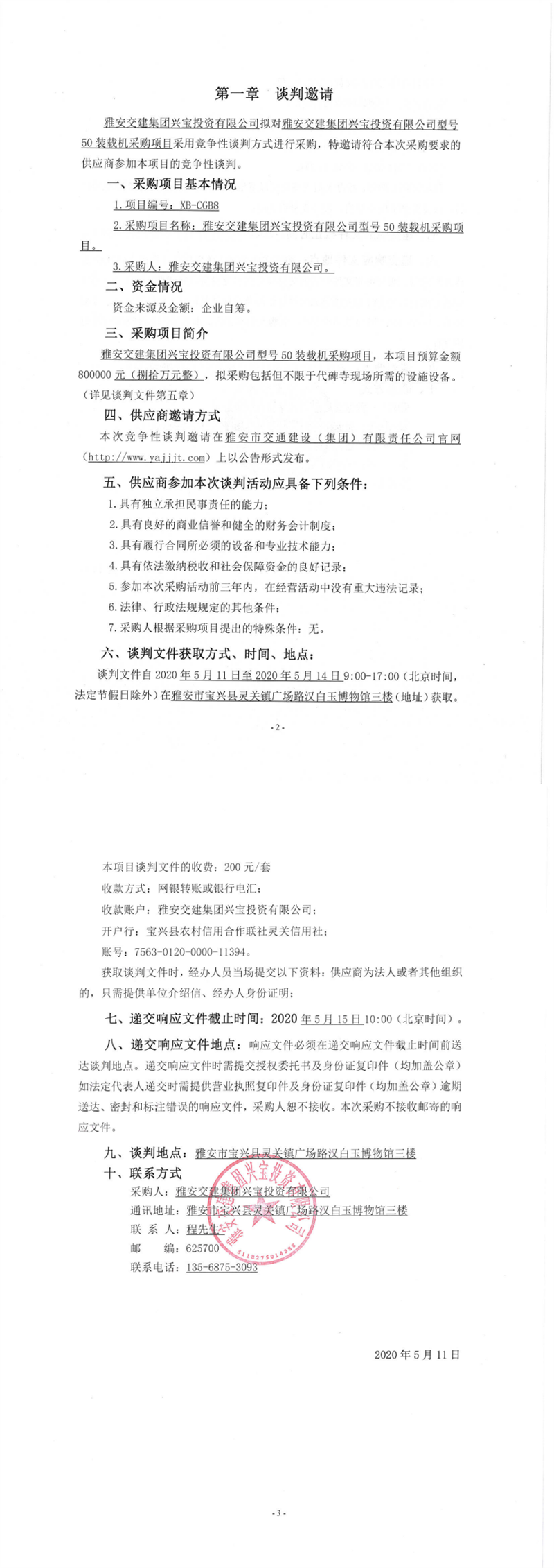 雅安交建集團(tuán)興寶投資有限公司型號50裝載機采購項目競爭性談判公告
