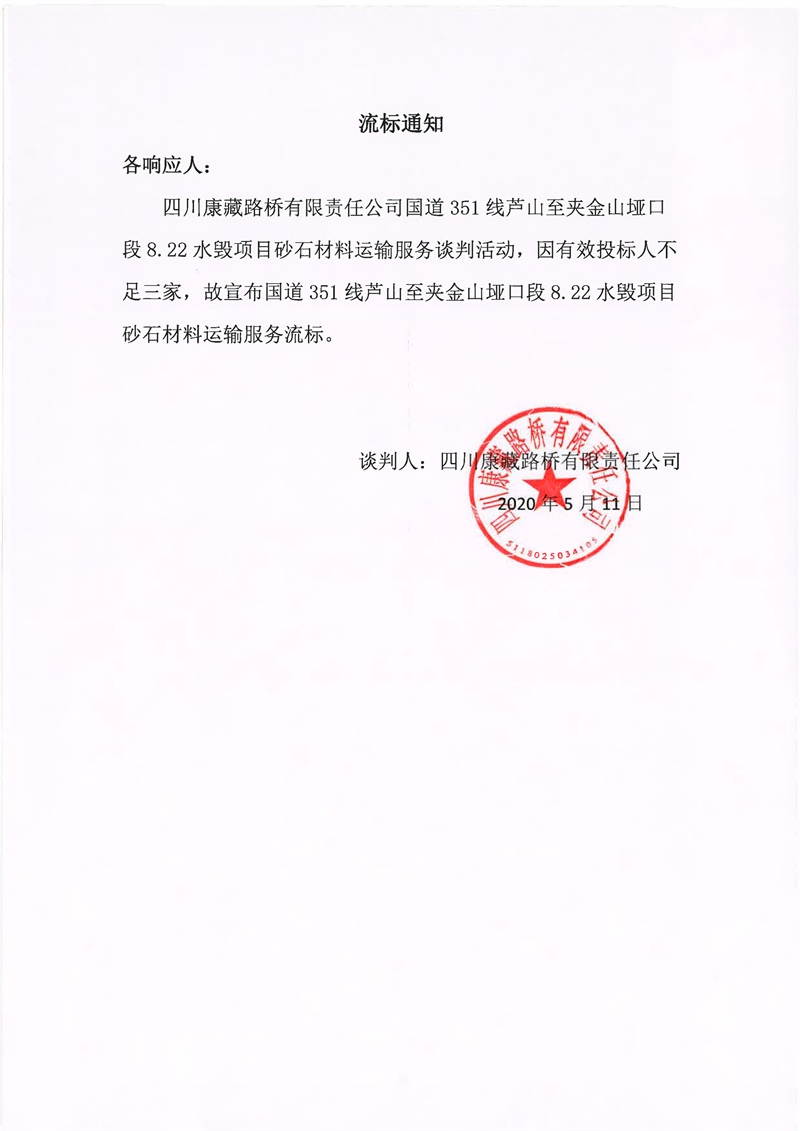 四川康藏路橋有限責(zé)任公司國道351線蘆山至夾金山埡口段8.22水毀項目砂石材料運輸服務(wù)流標(biāo)通知