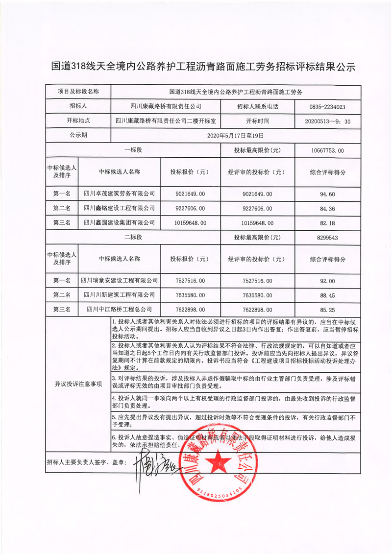 四川康藏路橋有限責(zé)任公司國道318線天全境內(nèi)公路養(yǎng)護工程瀝青路面施工勞務(wù)招標(biāo)評標(biāo)結(jié)果公示