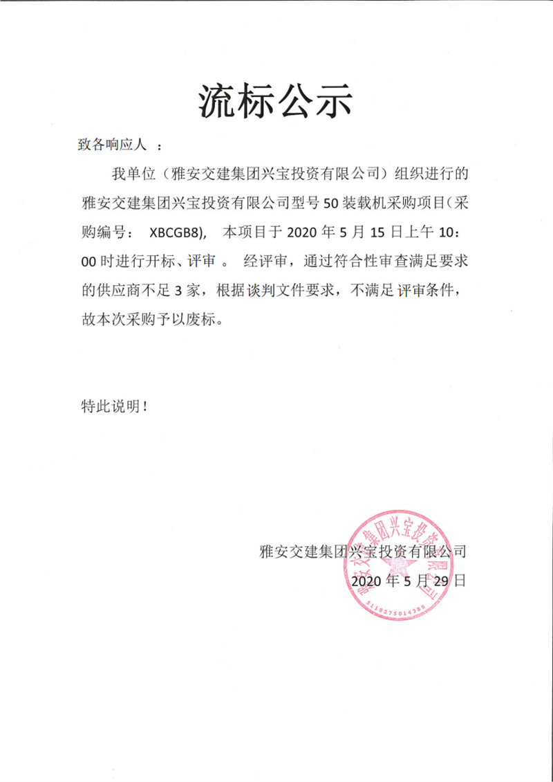 雅安交建集團(tuán)興寶投資有限公司型號50裝載機采購項目流標(biāo)公示